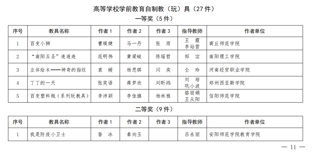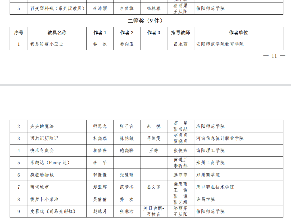 时间:2022-09-28 17:39:24 来源: 作者: 阅读: 次近日,河南省教育厅公布了第十九届河南省中小学幼儿园自制教(玩)具暨学生科技创新小制作小发明评选活动获奖名单,beat365官网首次参赛的2件作品均获佳绩。其中,2020级学前教育本科2班李沛颖、李佳旗、杨林雅的作品《百变塑料瓶(系列玩教具)》(指导教师:骆丽娟、王从阳)获高等学校学前教育自制教(玩)具组一等奖,2020级学前教育本科1班赵越月、张琳洁、美日古丽•吾拉音的作品《皮影戏<司马光砸缸>》(指导教师:骆丽娟、王从阳)获二等奖。