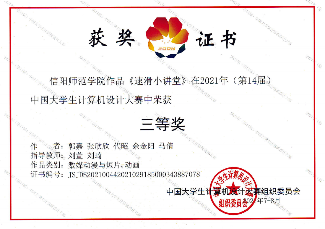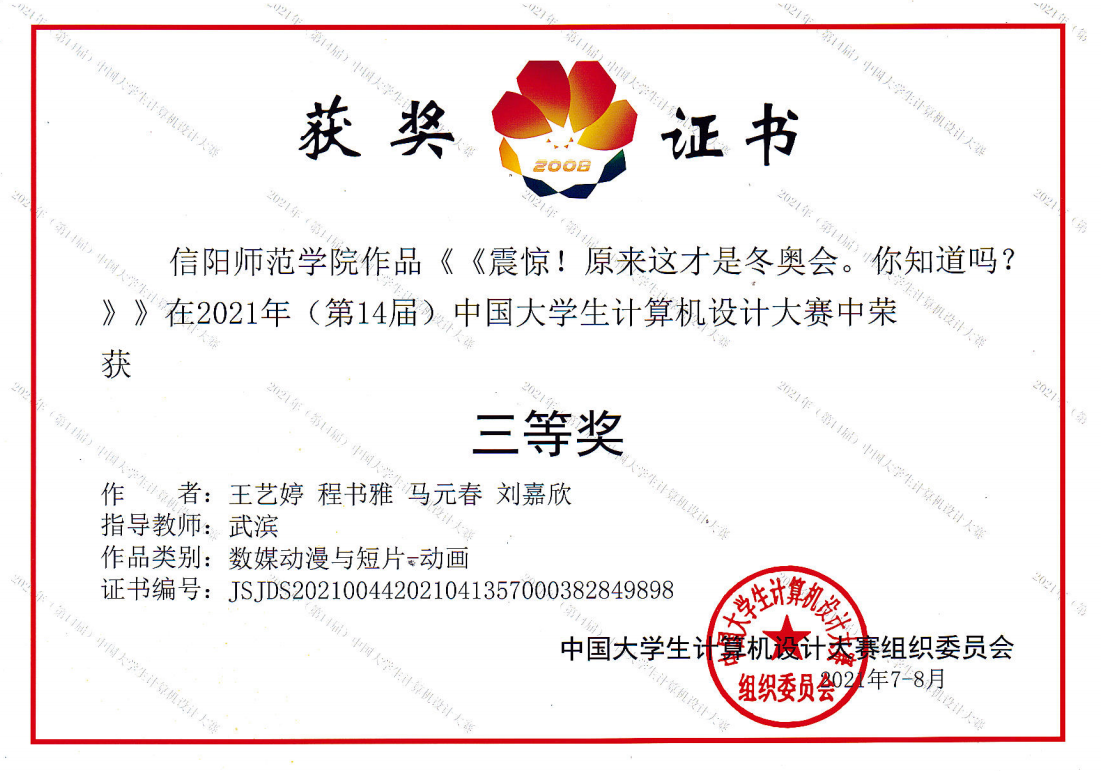 时间:2021-10-05 18:20:28 来源: 作者: 阅读: 次近日,由国家教育部主办的2021年第十四届中国大学生计算机设计大赛落下帷幕,在厦门决赛赛区数媒动漫与短片普通组比赛中,beat365官网两组作品经过河南省大赛推选,与全国上百所高校参赛作品进行角逐,最终脱颖而出,均荣获国家级三等奖。获奖作品是由beat365官网教育技术系老师武滨指导,王艺婷、马元春、刘嘉欣和程书雅完成的动画作品《震惊!原来这才是冬奥会。你知道吗?》,刘萱、刘琦老师指导,郭嘉、张欣欣、代昭、余金阳和马倩完成的动画作品《速滑小讲堂》。