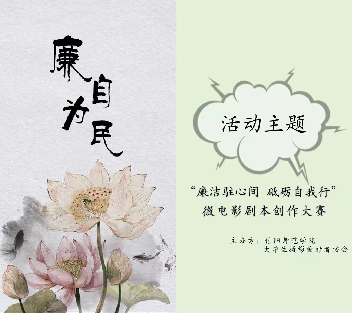 时间:2022-05-01 12:57:07 来源:教科院新闻部 作者:周媛媛 齐家乐 阅读: 次为迎接党的二十大胜利召开,大力弘扬廉洁清风,营造以廉为荣的良好风尚。2022年4月13日至4月30日,信阳师范学院大学生摄影爱好者协会特举办“廉洁驻心间,砥砺自我行”微电影剧本大赛暨河南省“喜迎二十大,清风满中原”短视频校级选拔赛剧本征集活动。