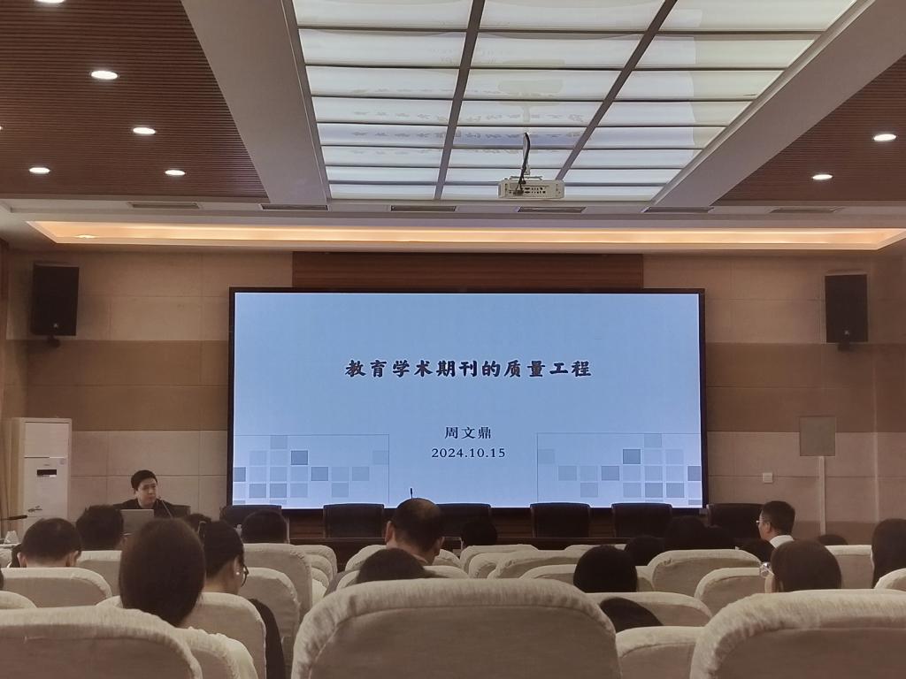 会上,周文鼎研究员谈及了“教育的新格局、新世代、新未来”,以及“什么是办好教育学术期刊的idea”,并总结了学术期刊的战略定位,对其目标定位和功能定位作了详细的阐释。同时,在学术期刊的栏目构建、组织实施和评估改进方面,周文鼎研究员一一地作出详细的讲解。尤其是在组织实施方面,他强调了1)以学术引领为导向,加强编委会建设;2)以能力建设为导向,加强编辑部建设;3)以质量保障为导向,加强审稿专家库建设;4)以资源聚合为导向,加强作者队伍建设。此外,为了让师生们更直观地理解,周文鼎博士列举了一些其审稿过程中具体的实例。