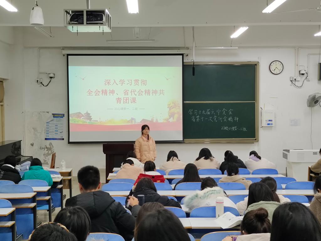 团课正式开始前,各团支部全体起立奏唱团歌,随后,各班认真观看“十九届六中全会精神”和“省第十一次党代会精神”的相关视频,团支书深刻解读十九届六中全会精神和省党代会精神,并由优秀团员代表进行发言。其中,2019级教育技术学班优秀团员代表任旭指出,十九届六中全会是一次具有开创性、里程碑意义的重要会议,作为新青年大学生,我们要紧跟中国共产党的步伐,从百年党史中汲取智慧力量和宝贵经验,锤炼过硬本领,当好党光荣传统和优良作风的忠实传承人,用理想信念之光照亮矢智奋斗之路。团课最后,广大团员交流学习收获和感想,纷纷表示作为新时代青年,要坚定理想信念,脚踏实地,勤学奋进,学好文化知识,将党的十九届六中全会精神和省党代会精神化为激励自身前行的强大动力,在新征程中书写青春华章。