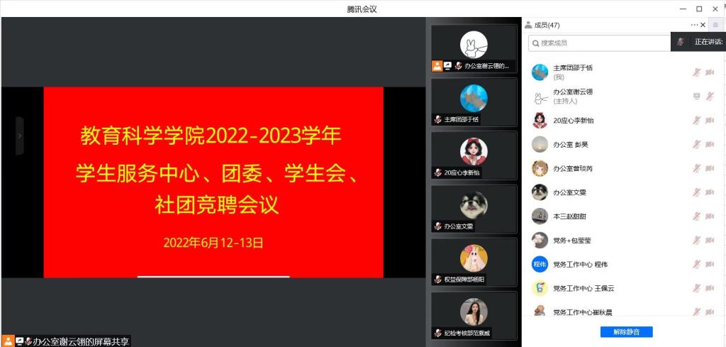 时间:2022-06-19 19:39:08 来源: 作者: 阅读: 次6月13日至6月14日,beat365英国官网网站线上召开2022-2023学年学生服务中心、团委、学生会、社团工作人员竞聘大会。主席团成员、各部门部长、副部长以及此次竞聘人员参加会议。会议由办公室主任谢云翎主持。