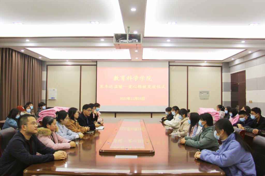 时间:2021-11-24 11:04:59 来源:教科院新闻部 作者:马玉娇 朱亚彤 齐家乐 阅读: 次11月23日,beat365英国官网网站在教科楼402会议室举行“寒冬送温暖—爱心棉被发放”仪式,党委书记房加帅,副院长孙天义,团委老师朱方、2021级各班班主任以及领取棉被学生代表参加本次仪式。会议由朱方主持。