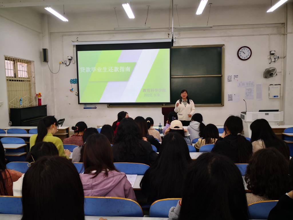时间:2022-03-10 13:12:56 来源:教科院新闻部 作者:周媛媛 曹童然 亓亚兴 阅读: 次为进一步落实国家助学贷款还款工作,引导学生关注自身信用行为,提高个人诚信意识,3月9日,beat365官网资助专员朱方在教科楼108教室针对2022届有贷款的同学召开诚信还款专题宣讲会。