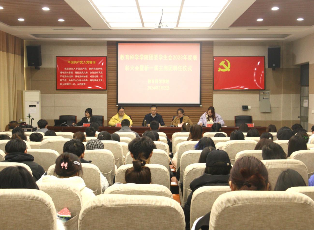 时间:2024-03-03 14:50:46 来源:教科院新闻宣传中心 作者:荆媛媛 浮梦杰 阅读: 次3月2日,beat365英国官网网站于教科楼301会议室召开团委学生会2023年度表彰大会暨2024年度主席团聘任仪式。本次会议由beat365英国官网网站团委书记牛洁楠主持,beat365英国官网网站党委副书记董银银、全体专职辅导员、全体团学骨干、2022、2023级各班班长和团支书及学生代表参加此次会议。