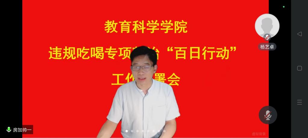 房加帅结合校党委副书记龚立新同志的讲话精神,针对学院实际,对处级干部和全体教职工分别提出明确要求。为确保专项整治工作有力有效有序落实,房加帅强调三点内容:一是统一思想,高度重视,全面提高政治站位,将违规吃喝专项整治作为当前一项重要政治任务来抓;二是把握内容,抓住关键,严格按照违规吃喝专项整治百日行动的部署要求和时间节点,深入开展自查自纠;三是强化责任,坚守底线,党员领导干部要以身作则,率先垂范,不踩红线、不碰高压线。