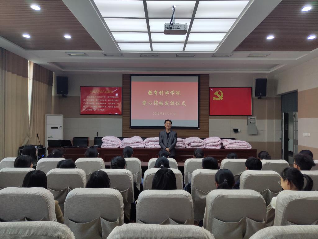 最后领导老师为同学分发爱心棉被,承载着爱与温暖的发放仪式在师生的欢声笑语中结束。