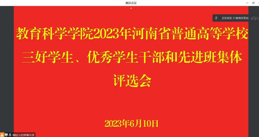 时间:2023-06-10 20:30:43 来源:教科院新闻宣传中心 作者:刘至涵 郭鑫瑶 阅读: 次6月10日,beat365英国官网网站于线上召开2023年河南省普通高等学校三好学生、优秀学生干部和先进班集体评选会。院党委副书记董银银,分团委书记牛洁楠,专职辅导员田园、杨艺卓、提尼格尔出席此次会议。会议由牛洁楠主持。