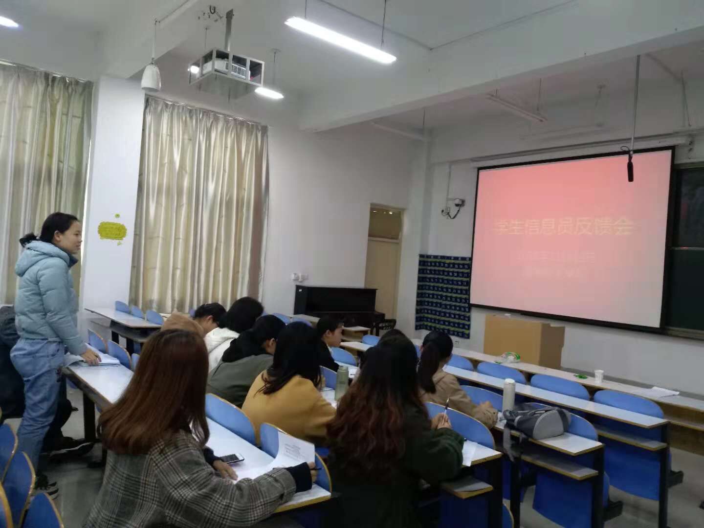 为了提高教师教学质量,为学生营造良好的教学环境,2018年11月13日下午,beat365英国官网网站教师督导员王书进副教授、杨建朝副教授、邢思珍副教授和教务员黄伟玲老师在教科203教室与各年级各班的学生信息员召开教学信息反馈会议。